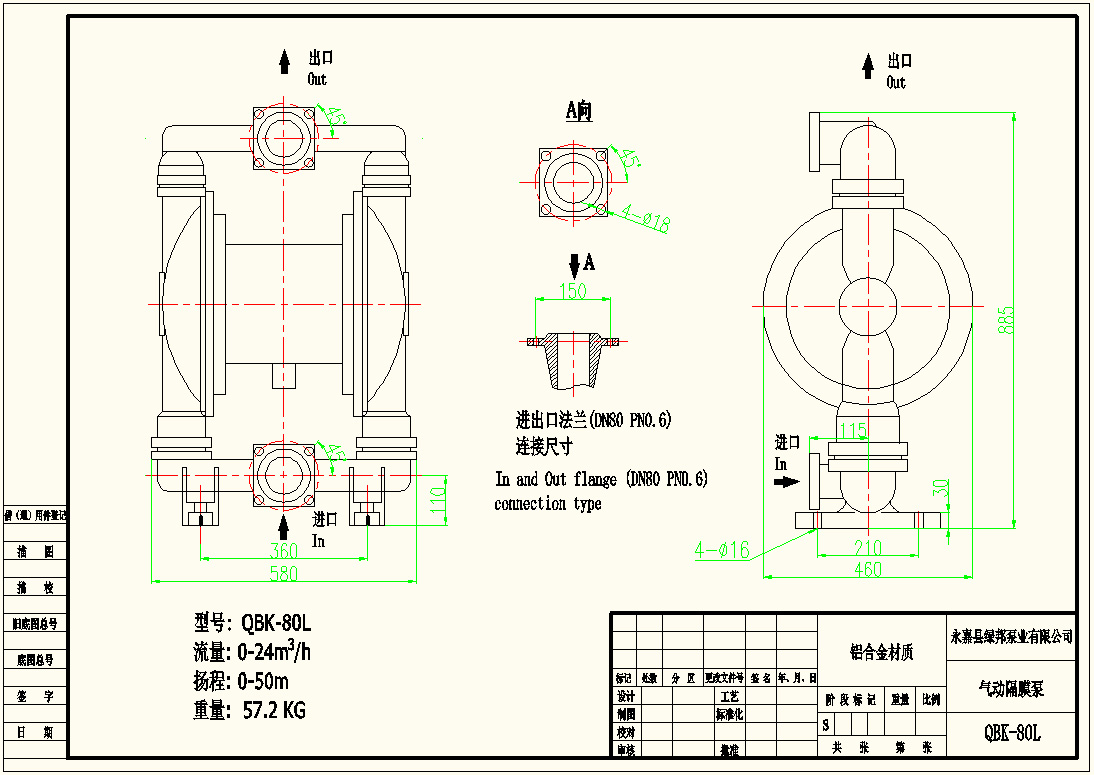 QBK-80L鋁合金氣動隔膜泵,泵體采用優質鑄鐵材質,配丁腈橡膠隔膜片,適用于污水,油類等無強腐蝕類介質的輸送。流量0-24m3/h,揚程0-50m,口徑DN80,法蘭連接。