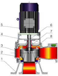 WL型立式排污泵主要由軸、軸承架、泵蓋、葉輪、泵座、電機支架、電機等部件組成。泵為立式單級單吸渦殼泵,葉輪采用雙流道結構,能有效通過泵口徑5倍的纖維物質及直徑為口徑50%的固體顆粒。產品執行JB/T6535-92《離心污水泵技術條件》標準。