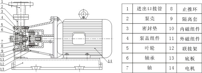 (六)磁力泵運行1500小時后,應拆檢軸承和端面動環的磨損情況,若軸承和軸套的間隙大于0.5~1mm,葉輪軸向竄動1.5~2mm時,應更換軸承和軸向動環。